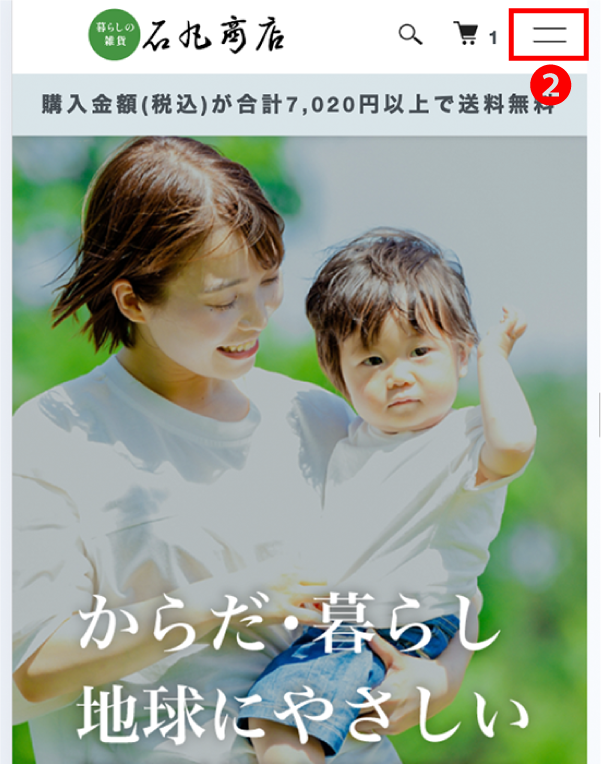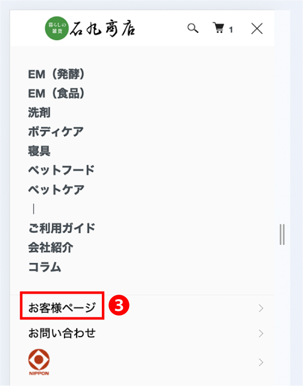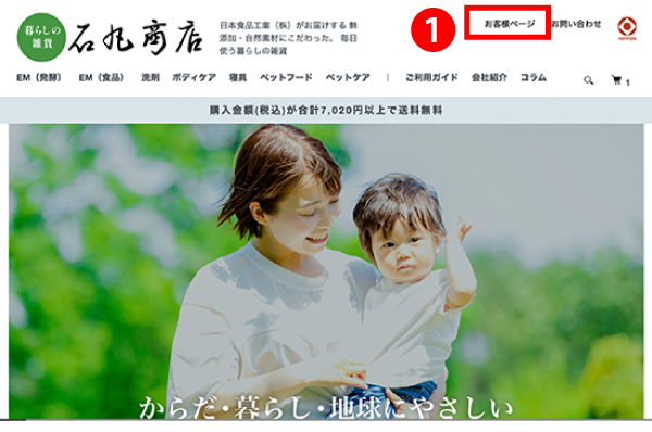 (ステップ1)ショップ会員にログインしてください。ページ上部にある『お客様ページ』(1)をクリックしてください。