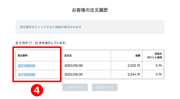 (ステップ3)お客様ページでは過去の購入履歴が確認できます。レビューしたい商品を購入された受注番号(4)をクリックして下さい。