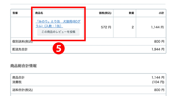 (ステップ4)『注文履歴詳細』画面へ移動します。ページ中程にある注文商品一覧の中からレビューしたい商品を選び『この商品のレビューを投稿』(5)をクリックしてください。