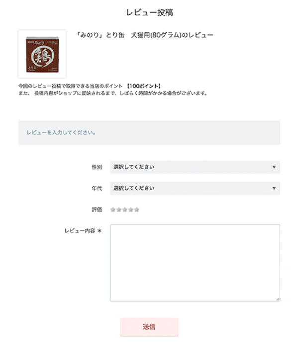 (ステップ5)『レビュー投稿画面』です。性別、年代、評価(5段階)と、レビュー内容を入力いただき、送信してください。