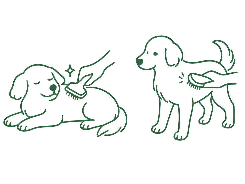 いきなり当てず、まず見せて匂いをかがせます。柄の部分で軽くタッチ→背中を1〜2回だけ、のように段階を細かく。できたら静かにほめます。